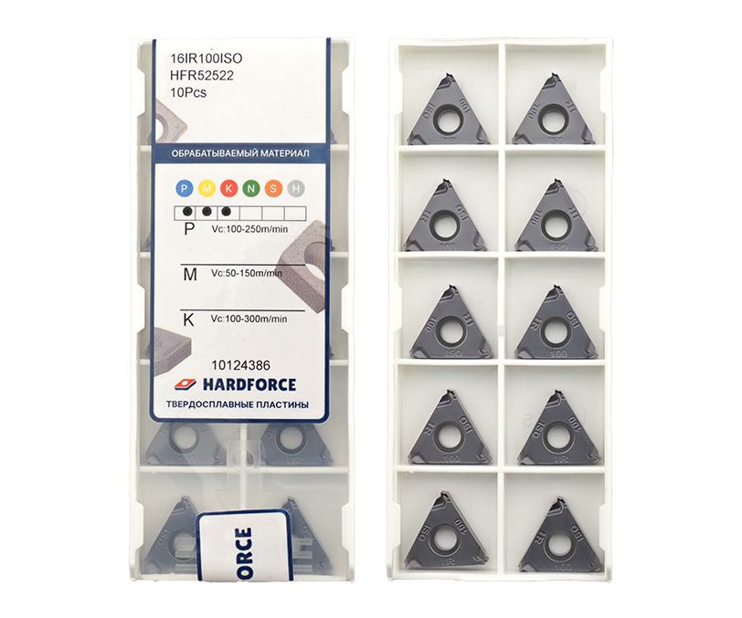 Твердосплавная сменная пластина 16IR-100ISO-HFR52522 используется для нарезания внутренней метрической резьбы 60° в заготовках нержавеющей стали.