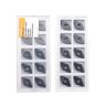 Сменная пластина 2NU-DNGA150404-KBCN700 используется для токарной получистовой обработки закаленной стали. Конструктивно представляет собой основу из твердого сплава, на одной стороне которой установлены две напайки из сверхтвердого материала PCBN с защитным покрытием. Форма пластины - D (ромб 55°). Негативная геометрия, задний угол N (0°). Радиус при вершине 0,4 мм.