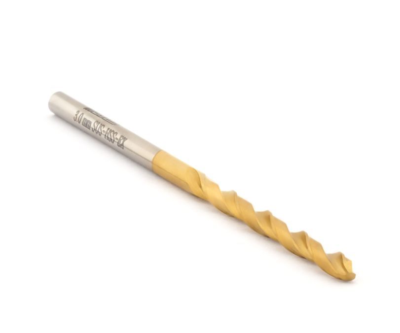 Спиральное сверло по металлу диаметром 3 мм, угол при вершине режущей кромки 135°, общая длина сверла 61 мм, длина режущейчасти 33 мм. Сверло изготовлено из быстрорежущей стали SUS HSS-EX (содержание Кобальта 6%) и предназначено для сверления отверстий в изделиях из нержавеющих и жаропрочных сталей. Для увеличения износостойкости сверла применено покрытие из Нитрида Титана (TiN).