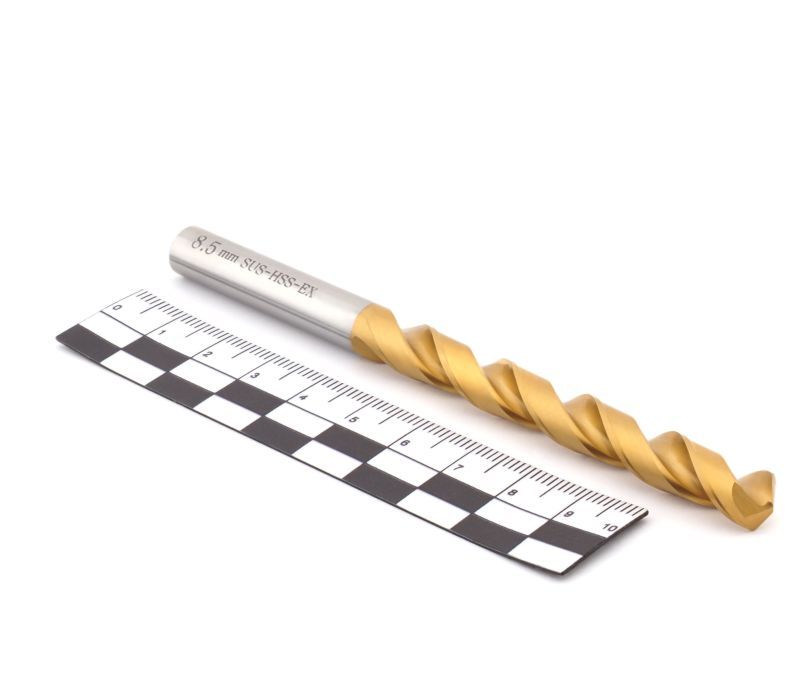 Спиральное сверло по металлу диаметром 8,5 мм, угол при вершине режущей кромки 135°, общая длина сверла 117 мм, длина режущейчасти 75 мм. Сверло изготовлено из быстрорежущей стали SUS HSS-EX (содержание Кобальта 6%) и предназначено для сверления отверстий в изделиях из нержавеющих и жаропрочных сталей. Для увеличения износостойкости сверла применено покрытие из Нитрида Титана (TiN).