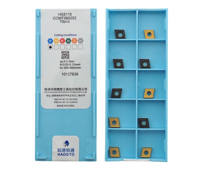 Твердосплавная сменная пластина CCMT060202-HS8115 бренда HADSTO применяется для чистовой обработки заготовок из стали.