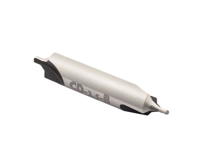 Двухстороннее сверло CD-2,5-B (DIN333, ГОСТ 14952) используется для создания высокоточных центровых отверстий типа B в заготовках из стали, нержавеющей стали, чугуна. Центровочный угол 60⁰, предохранительный конус 120°. Инструмент изготовлен из высококачественной быстрорежущей стали HSS-6542. Диаметр 2,5 мм, длина направляющей 3,1 мм, общая длина сверла 56 мм.