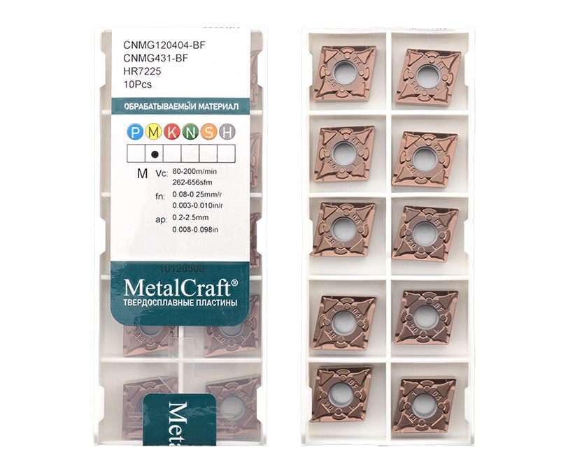 Твердосплавная сменная пластина CNMG120404-BF-HR7225 бренда MetalCraft применяется для чистовой обработки заготовок из нержавеющей стали.