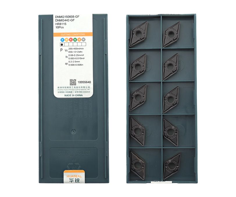 Твердосплавная сменная пластина DNMG150608-GF-HR8115 бренда Huareal применяется для чистовой обработки заготовок из стали.