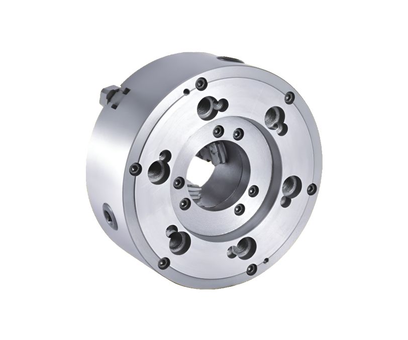 Токарный патрон K11-380C/D8 диаметром 325 мм / 12" используется для фиксакции заготовки на шпинделе станка. Максимальная скорость вращения патрона 1000 об/мин. Самоцентрирующийся спирально-реечный механизм с тремя цельными кулачками обеспечивает быструю и надежную фиксацию деталей цилиндрической или шестригранной формы. Тип посадки патрона - на конус шпинделя с креплением шпильками Camlock (ГОСТ 26651, DIN 55029). Корпус патрона изготовлен из серого чугуна (HT300), кулачки - из легированной стали (20CrMnTi).