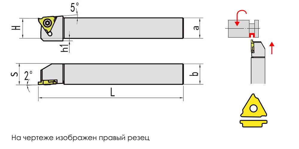 Резец токарный (державка) TKGFR1616M-16F по металлу со сменными пластинами. Применяется для обработки наружных канавок. Сечение резца - 16 x 16 мм; длина - 150 мм.