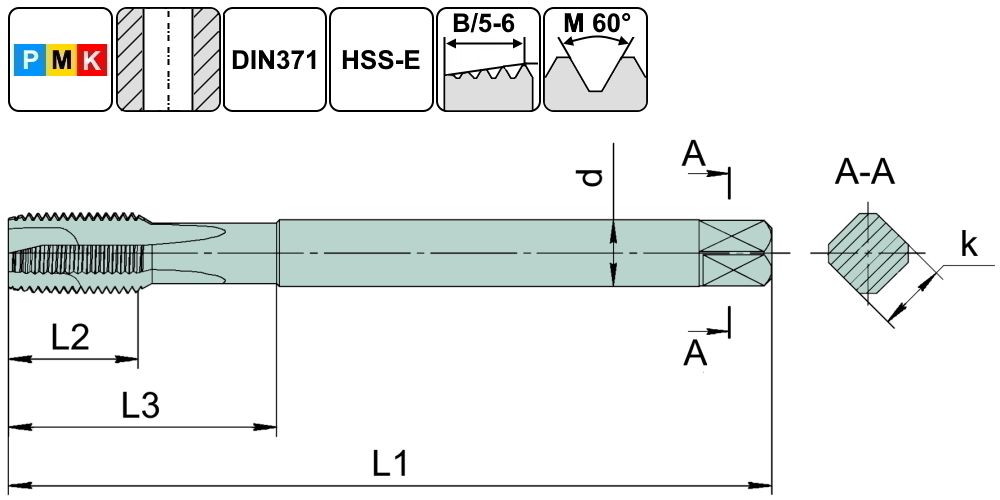 TSP1.M10х1,5.6H.DIN371.TiN Метчик M10х1,5 для сквозных отверстий, DIN371 с покрытием TiN