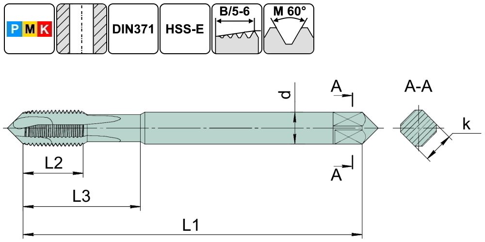 TSP1.M6х1,0.6H.DIN371.TiN Метчик M6х1,0 для сквозных отверстий, DIN371 с покрытием TiN